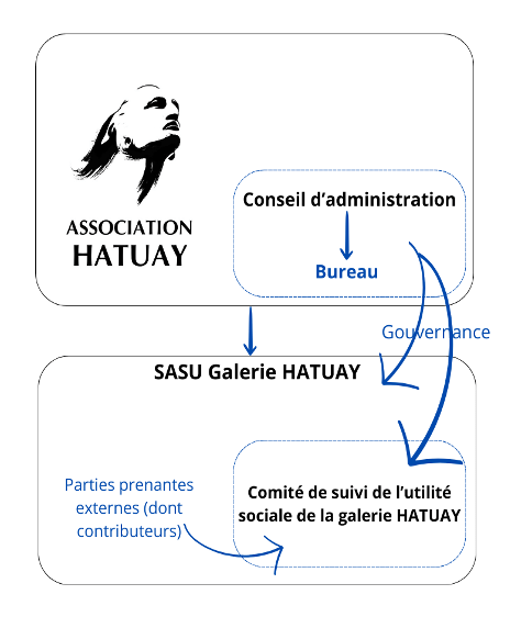 HATUAY étant une association très jeune, avec comme premier projet la galerie, le chiffre d’affaire généré par celle-ci pourrait vite générer des dépassements règlementaires. D’autre part, le maximum légal de chiffre d’affaires sans imposition pour une association pourrait être rapidement dépassé si la galerie fonctionne bien.Dans ce contexte et pour ne pas faire prendre de risques à l’association HATUAY, il sera étudié la constitution d’une société commerciale SASU filiale de l’association HATUAY pour mener l’activité commerciale de la galerie. Cette SASU serait déclarée de l’Économie Sociale et Solidaire. Le président serait nommé par l’association.