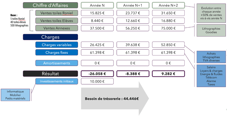 La projection de compte de résultats de la galerie HATUAY montre un besoin de trésorerie d’environ 45.000€ sur les deux premières années. L’estimatif de vente est prévu raisonnablement et avec une valorisation des toiles sur la fourchette basse.